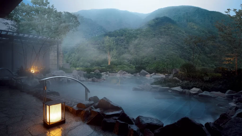 最大の自慢は、渓谷に向かってせり出すように設計された露天風呂「三日月の湯」です。目の前に広がる箱根の連山と一体になるような開放感は、日々の疲れをまたたく間に溶かしてくれます。夜には月を眺め、朝には鳥のさえずりを聞きながら浸かる源泉かけ流しの湯は、まさに至福のひととき。