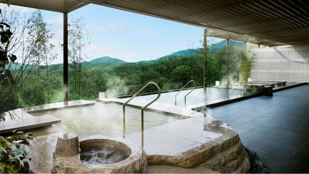 最大の特徴は、4つの異なる源泉を一度に楽しめる贅沢な温泉施設です。緑に囲まれた露天風呂や、まるで水庭に浮かんでいるかのような感覚になる大浴場は、静寂の中で心ゆくまで湯浴みを楽しみたい大人にこそふさわしい空間。
